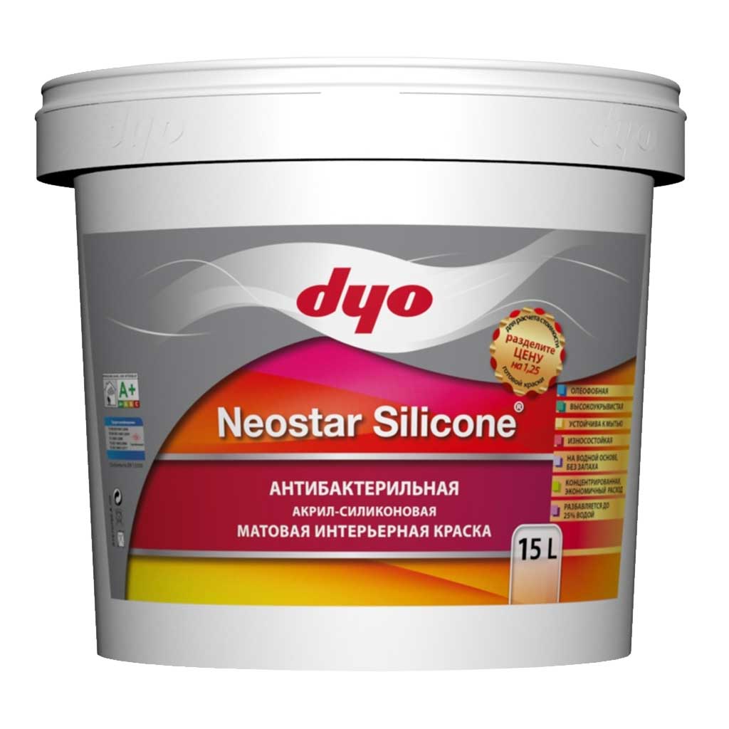 Vopseaua Dyo Neostar Silicone are o acoperiere excelenta datorită siliconului. Vopseaua respinge perfect apa și are proprietăți ridicate de permeabilitate la vapori și previne formarea ciupercilor și mucegaiului. După uscare, formează un strat puternic de lungă durată, rezistent la formarea de fisuri și zgârieturi. Rezistent la curățarea umedă folosind detergenți neabrazivi. Usor de aplicat fara pulverizare, fara a forma subtexte. Nu are solvenți în compoziția sa, este ecologic, inodor, îndeplinește standardele europene pentru conținutul de substanțe organicevolatile (VOC scăzut) pentru produsele din această categorie.